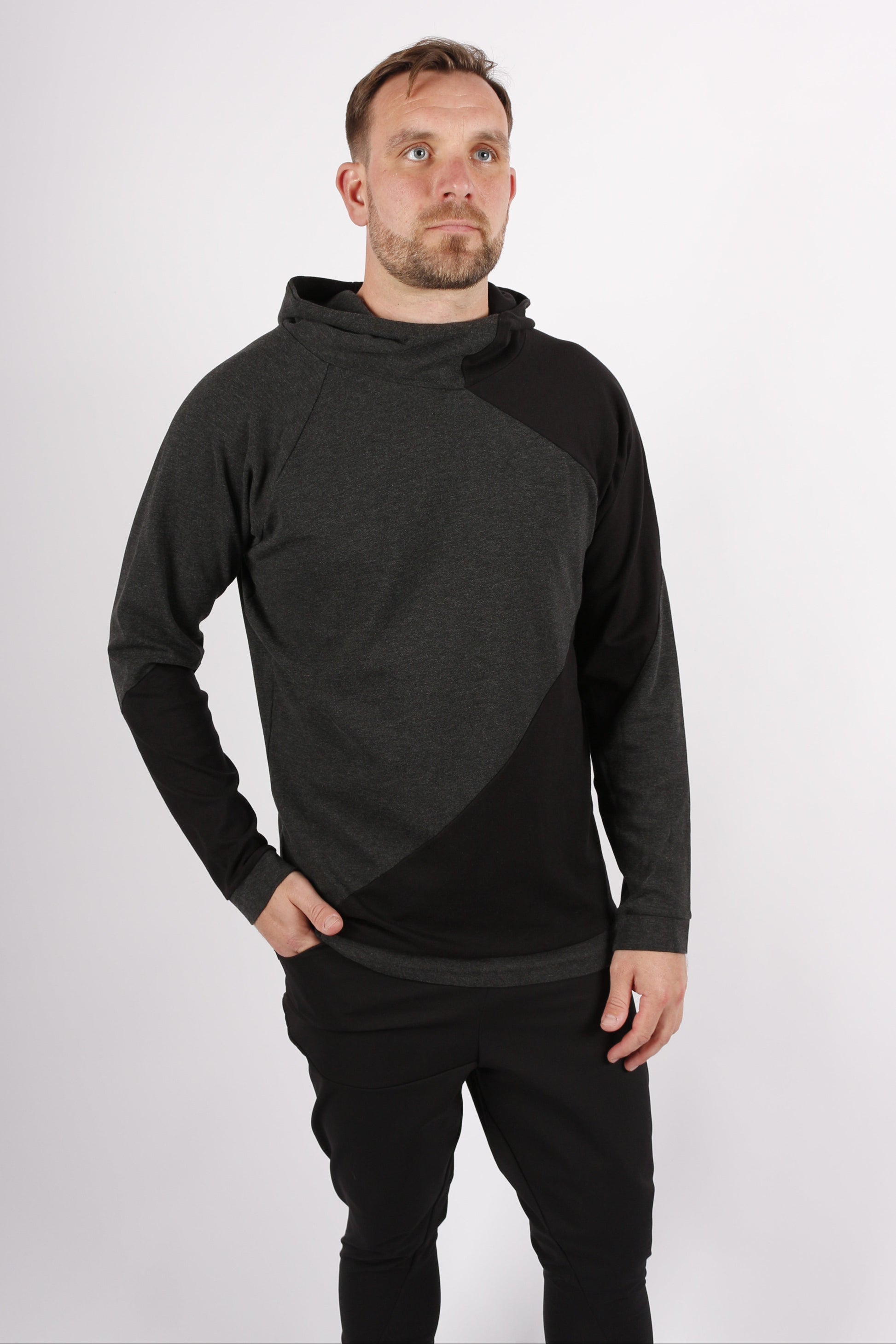 Dieser Kaseee Hoodie im maskulinen Schnitt überzeugt durch klare Linien und raffinierte Details. Zwei Farben wurden durch asymmetrische Nähte zu einem modernen Look vereint, der stilvoll und trotzdem alltagstauglich ist. Der hochwertige Jersey bietet angenehmen Tragekomfort und macht den Hoodie zu einem wandelbaren Begleiter. Ob sportlich, lässig oder leicht aufgewertet für den urbanen Alltag – dieses Teil ergänzt jeden Kleiderschrank um ein besonderes Basic.