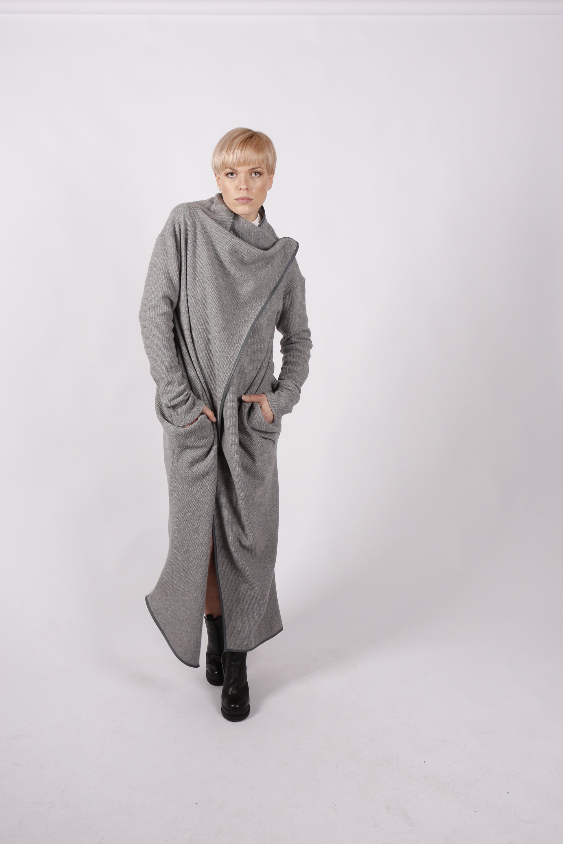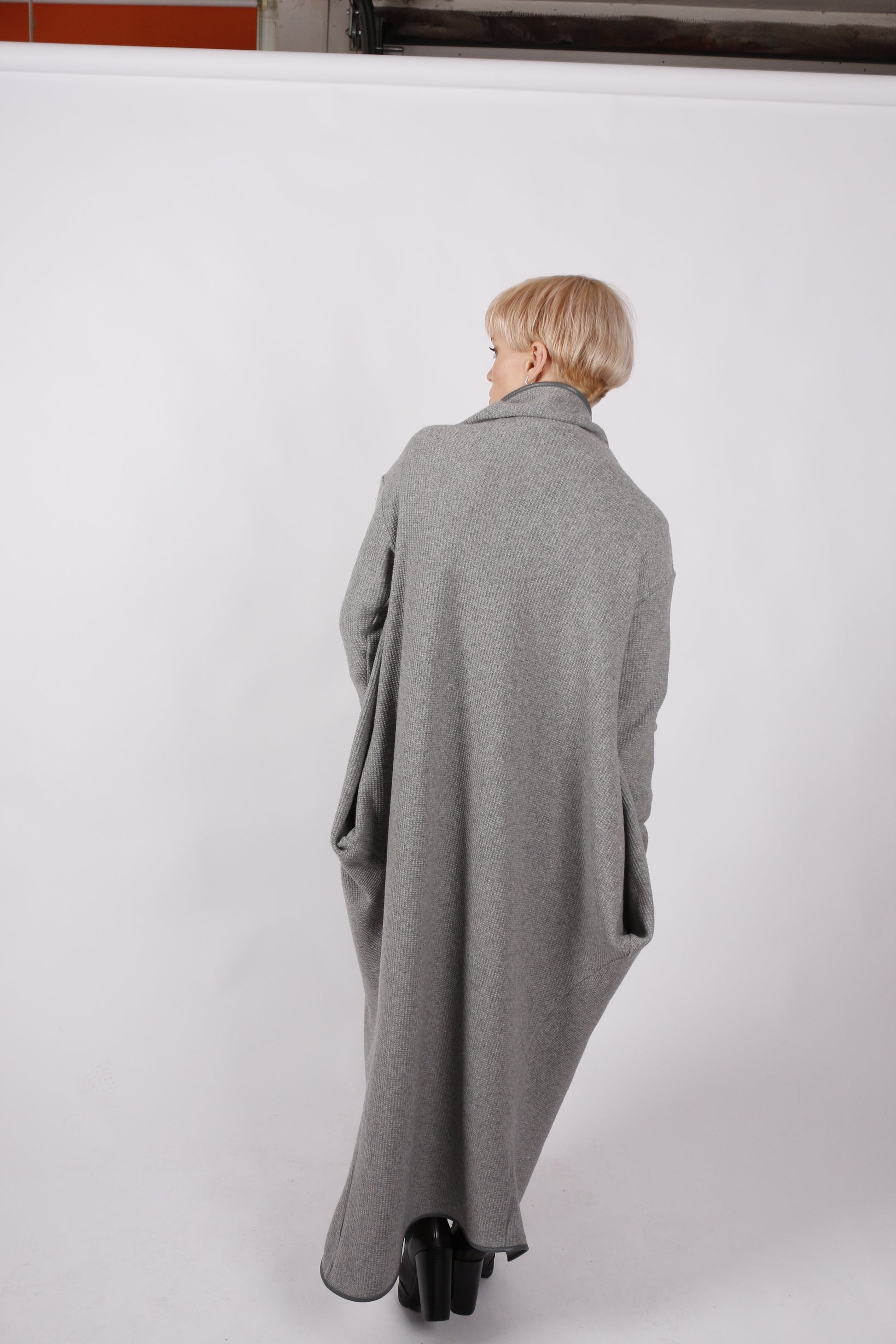 Besonders auffällig ist die spitz zulaufende Ecke, die locker in S-Form fällt oder für einen cleaneren Look an der Schulter fixiert werden kann. Das schräg verlaufende Revers und der flexibel drapierbare Kragen sorgen für zusätzliche Ausdrucksstärke. Zwei nach innen gearbeitete Taschen sorgen nicht nur für Funktionalität, sondern unterstützen durch ihre Platzierung die elegante Linienführung.