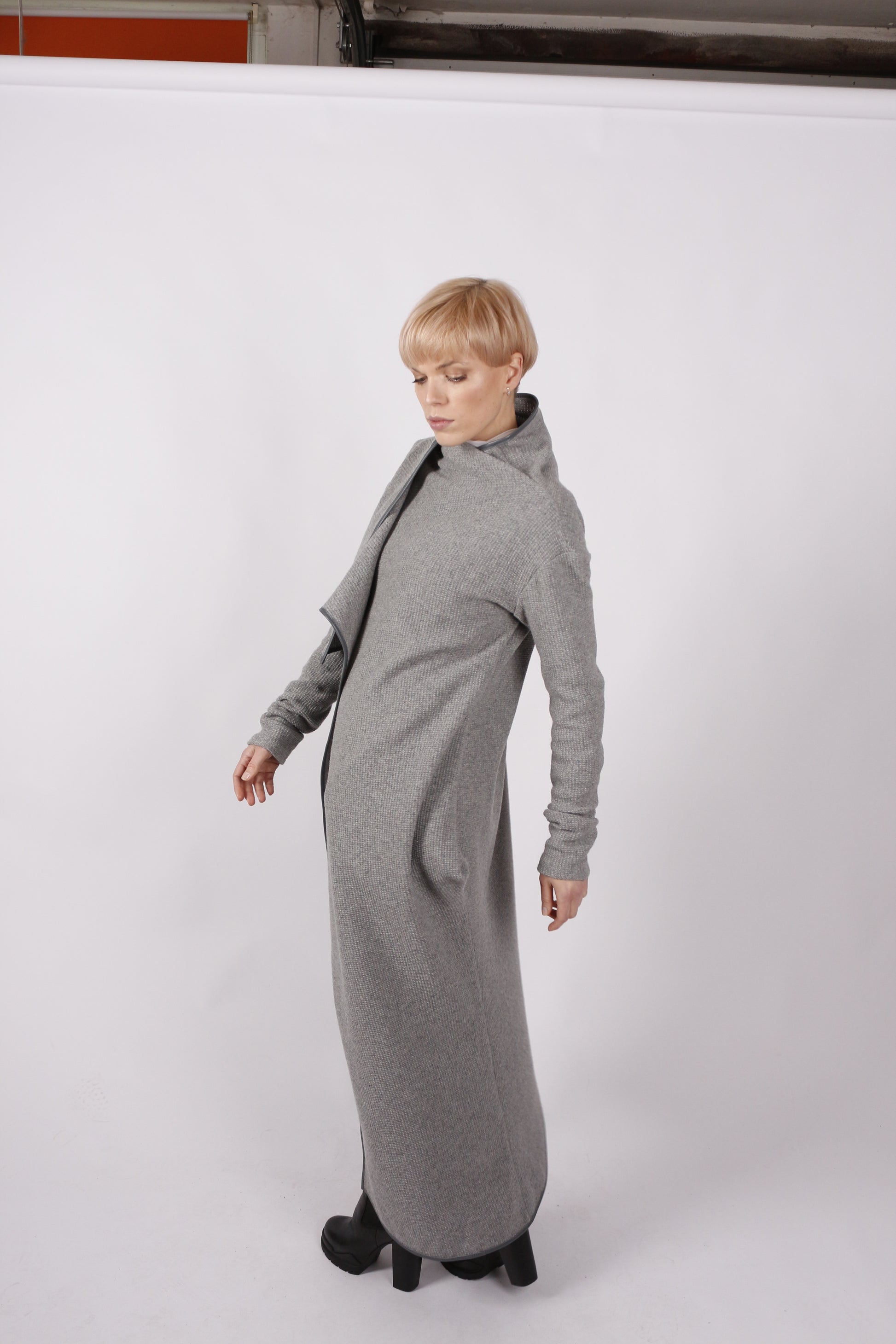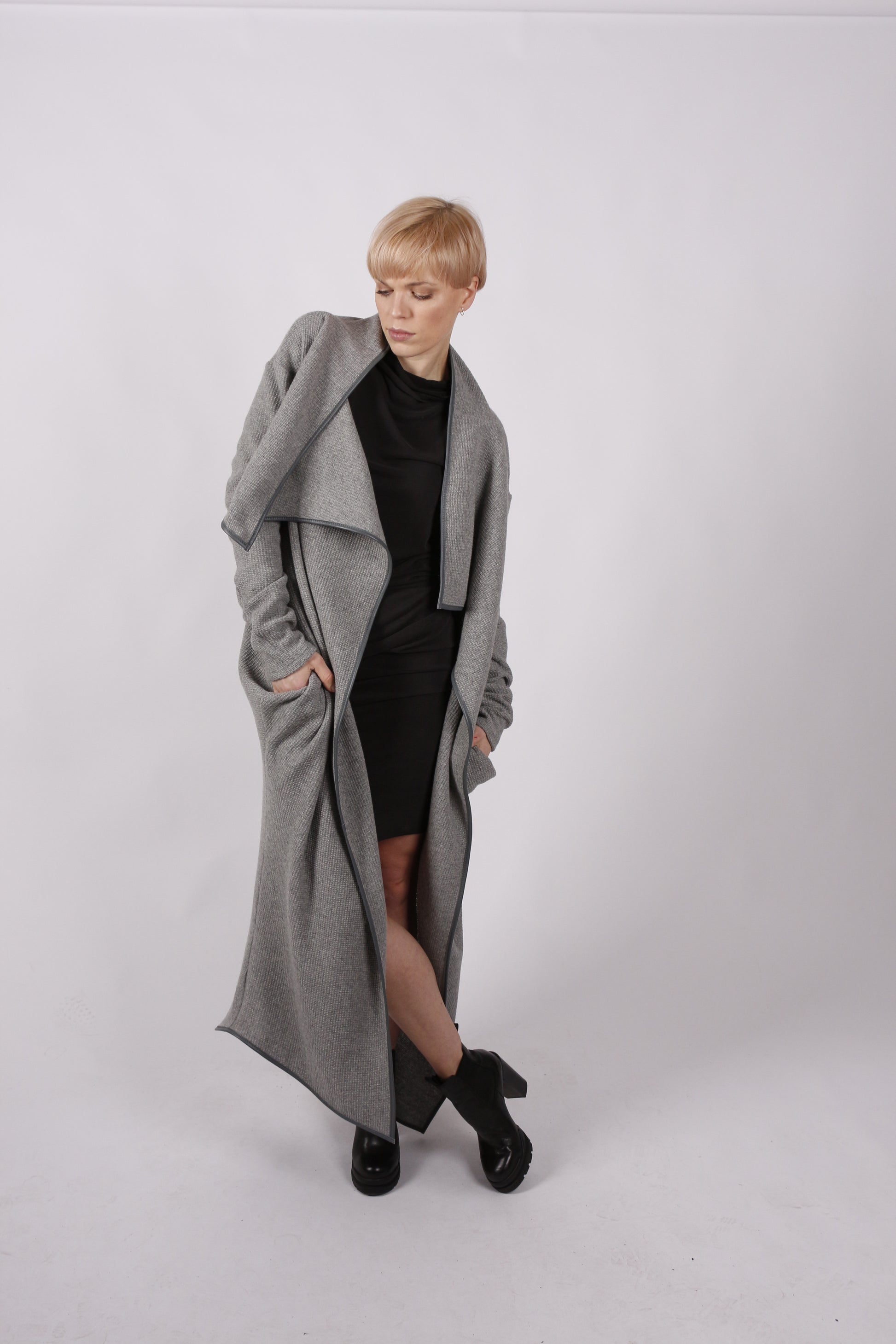 Dieser elegante kaseee Mantel aus hochwertiger grauer Wolle kombiniert klare Linien mit einem außergewöhnlich legeren Design. Die lange Form reicht bis kurz über die Knöchel und betont durch raffinierte Details eine feminine Silhouette ganz gleich, ob offen getragen oder geschlossen.