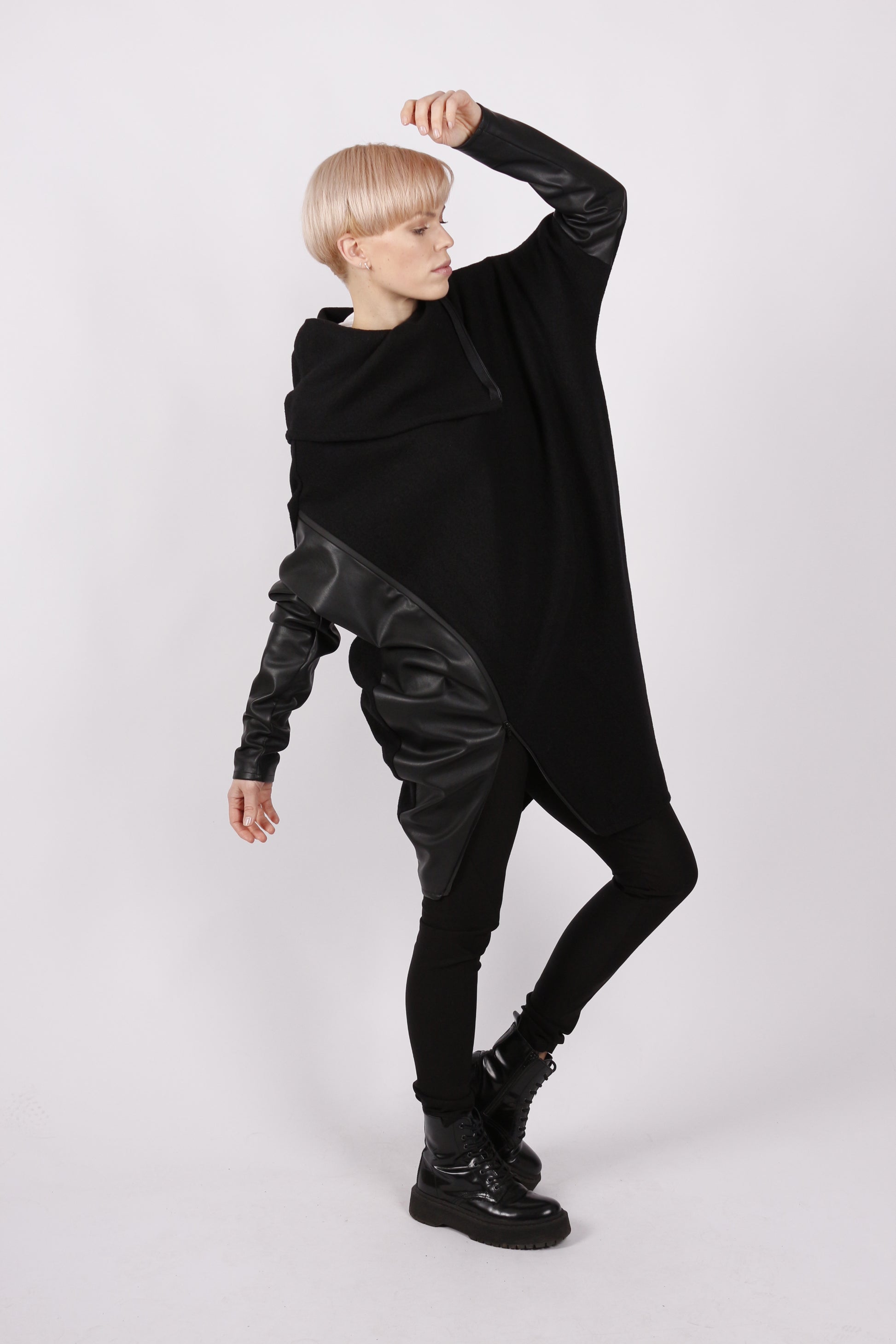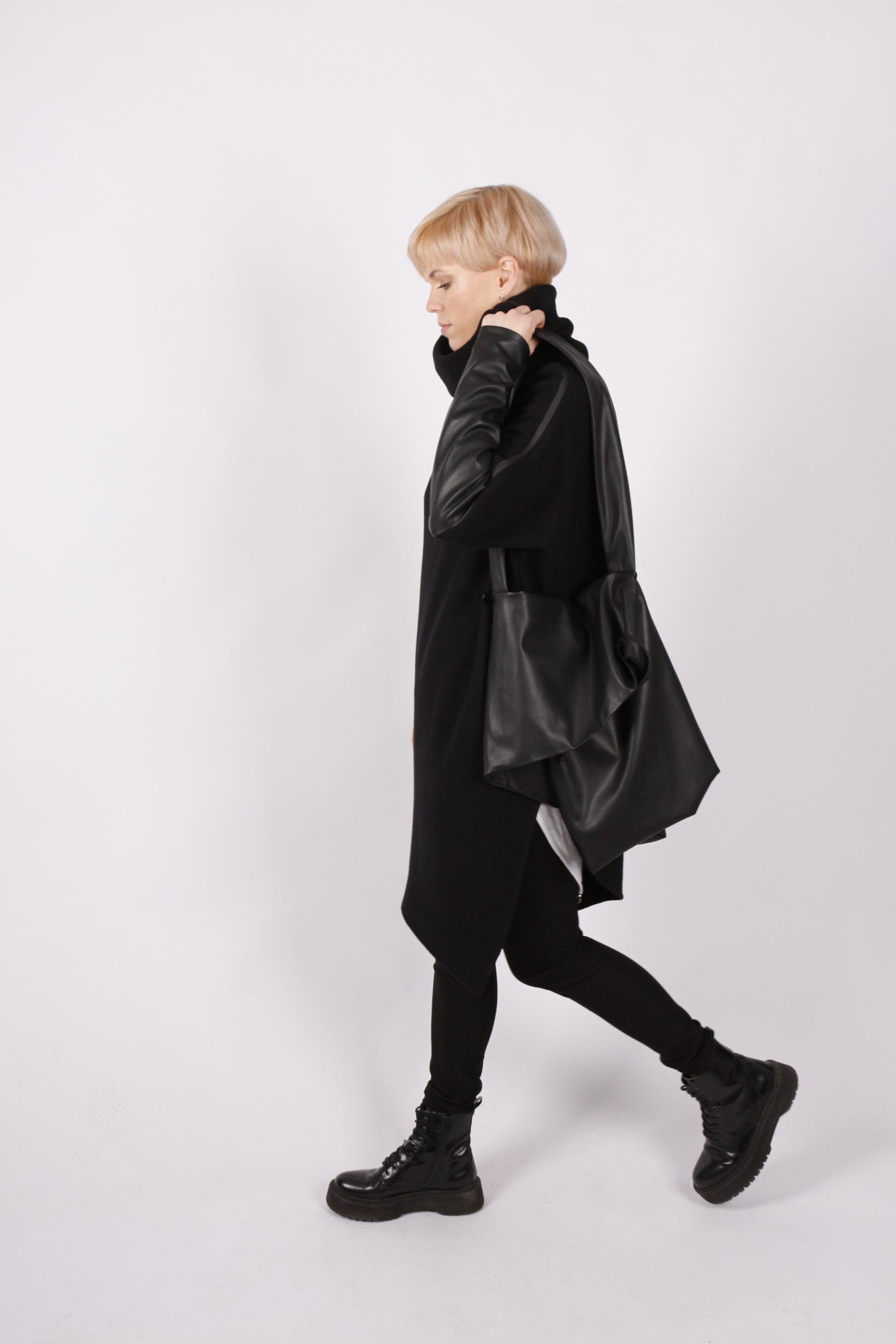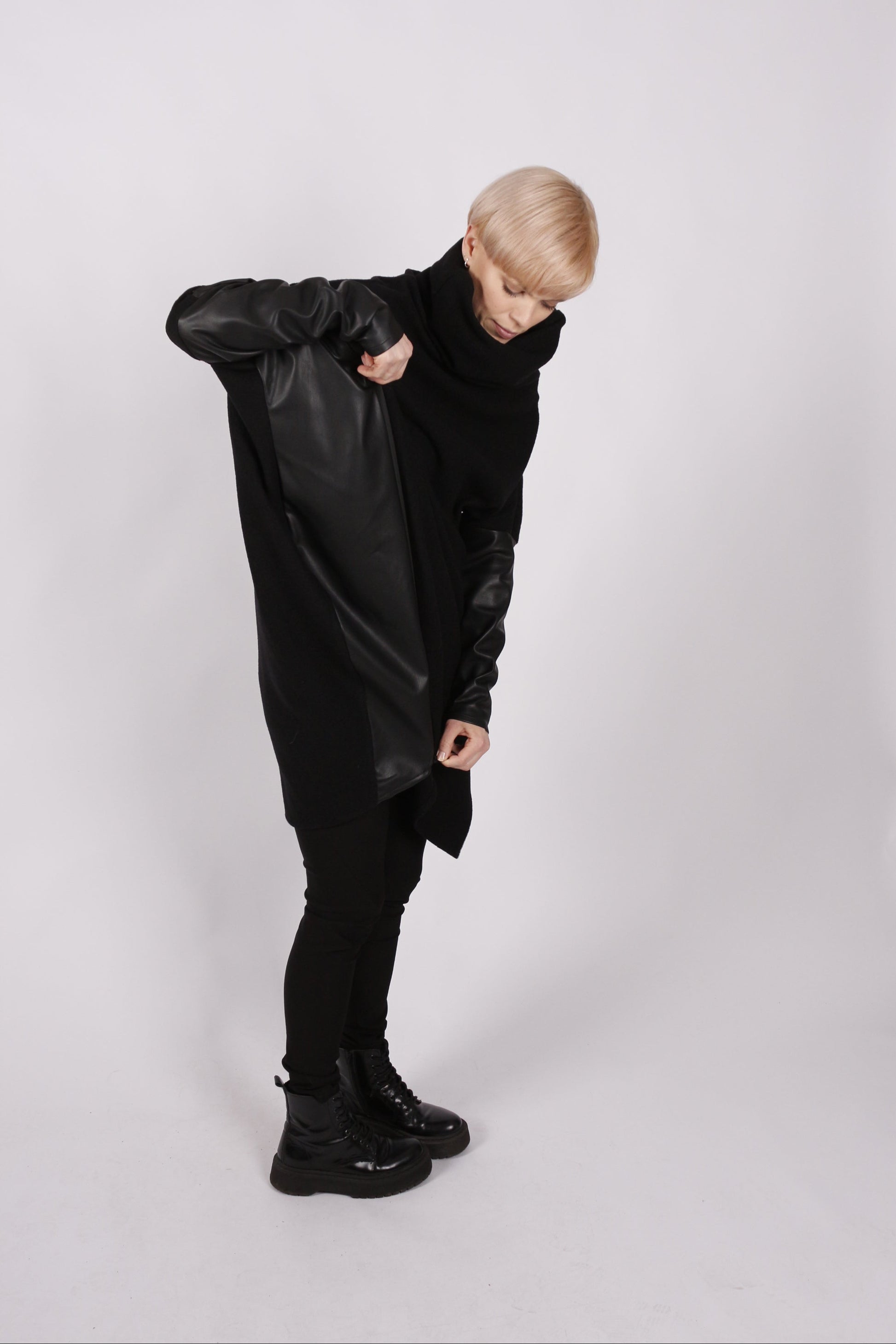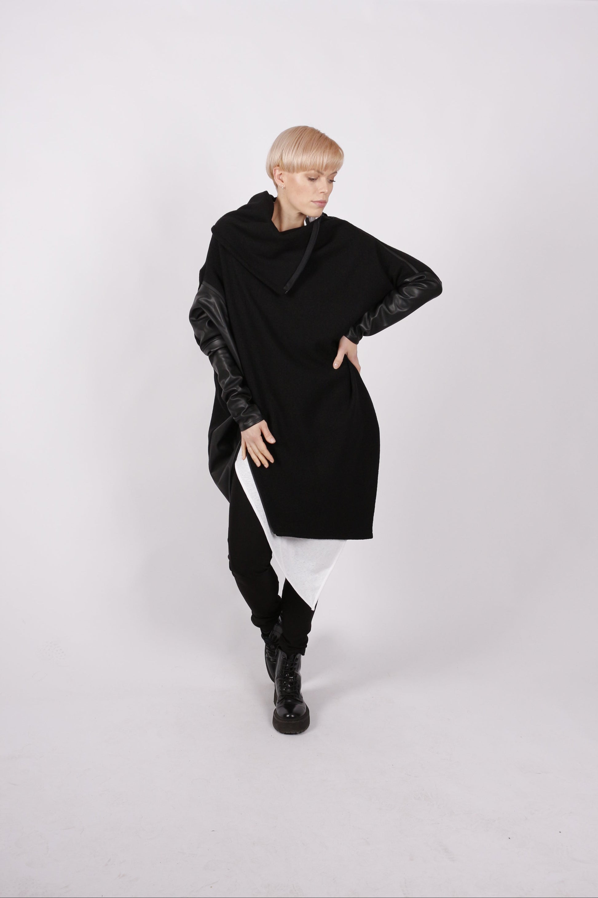 Besonders markant: die Ärmel aus weichem Kunstleder, die wie integrierte Stulpen wirken und dem Look eine kraftvolle Kante geben. Der seitlich gesetzte Reißverschluss lässt sich komplett öffnen oder schließen. So verändert sich nicht nur der Stil, sondern auch die Funktion: offen wirkt das Teil wie ein moderner Pulli, geschlossen wie ein cleaner Mantel.