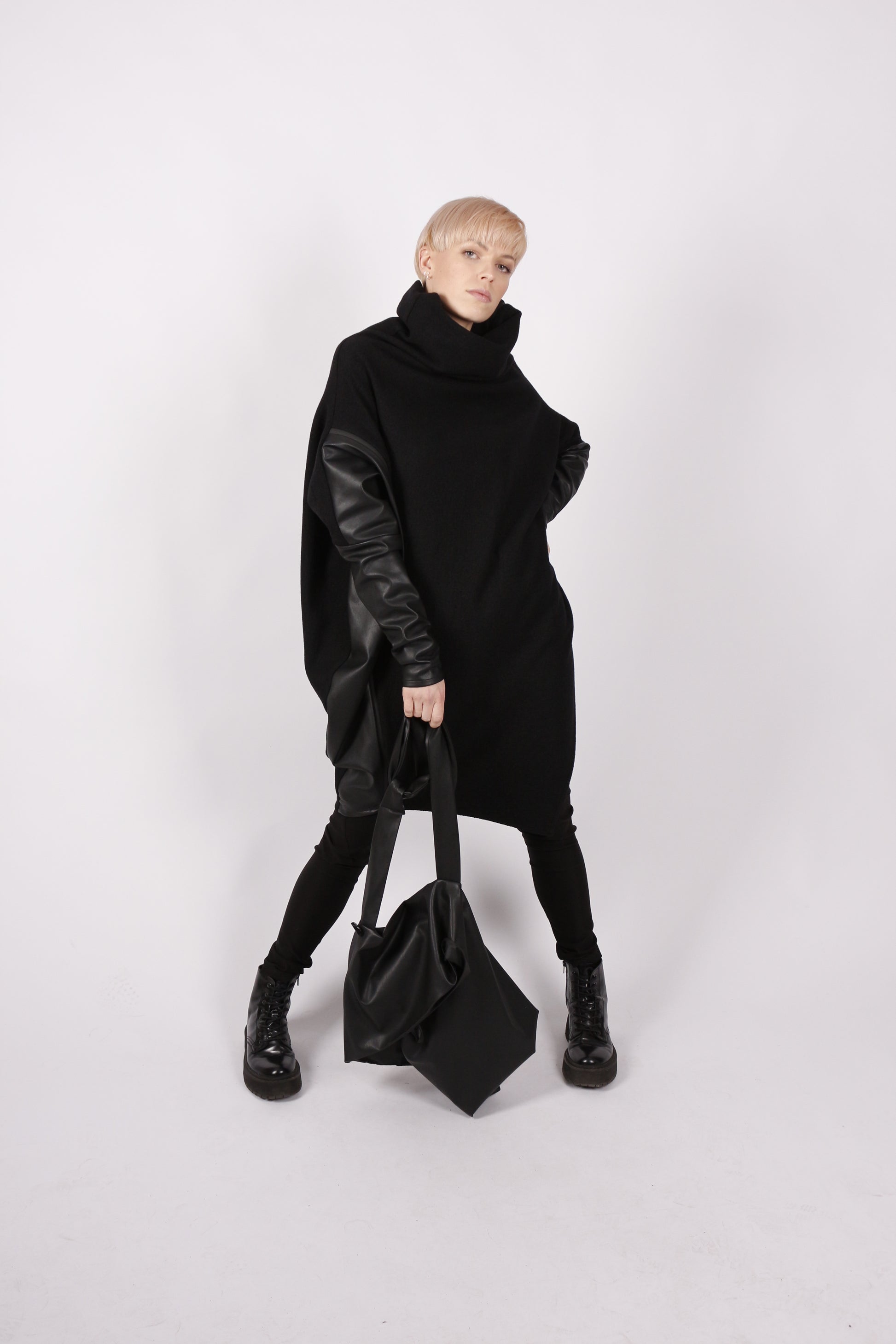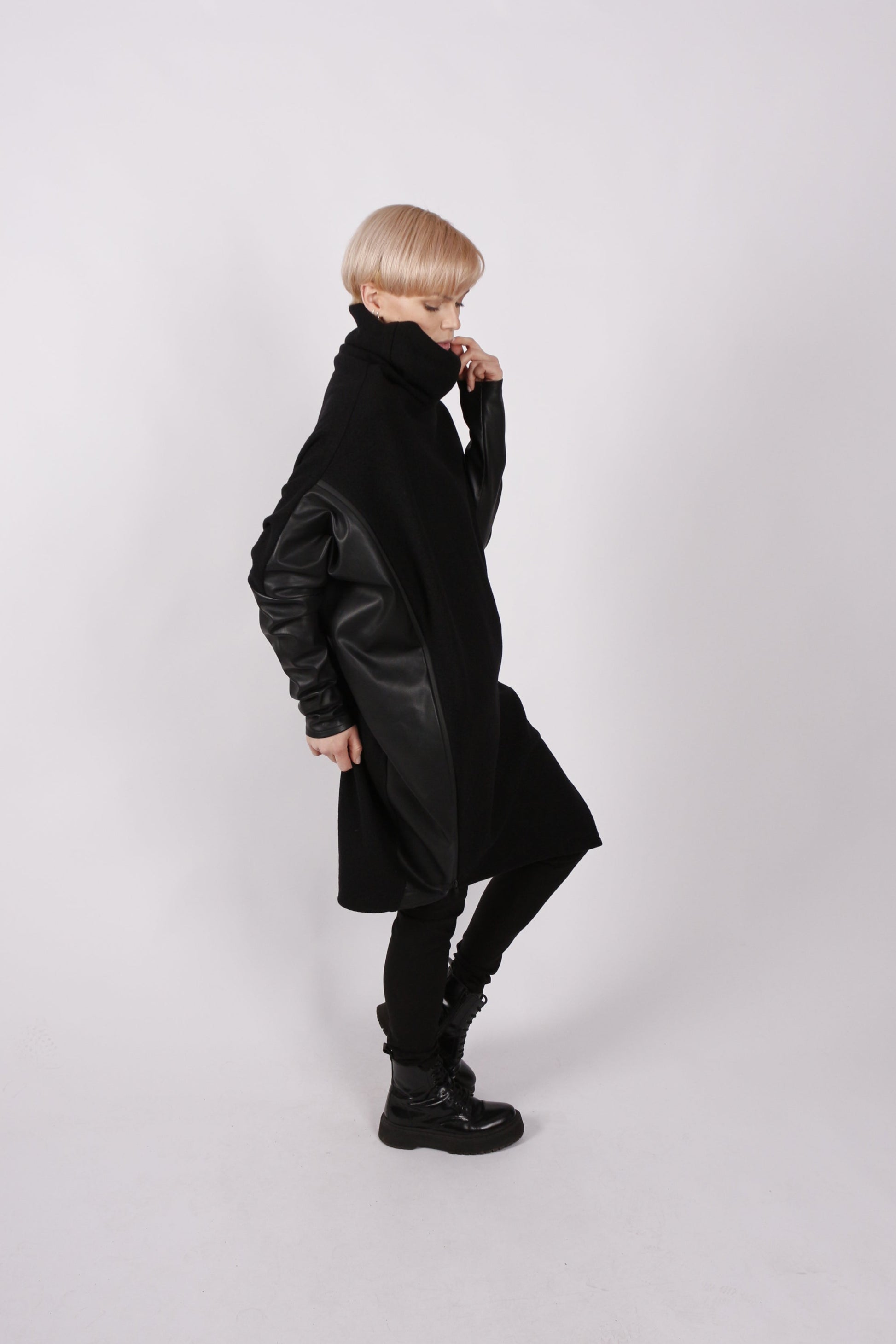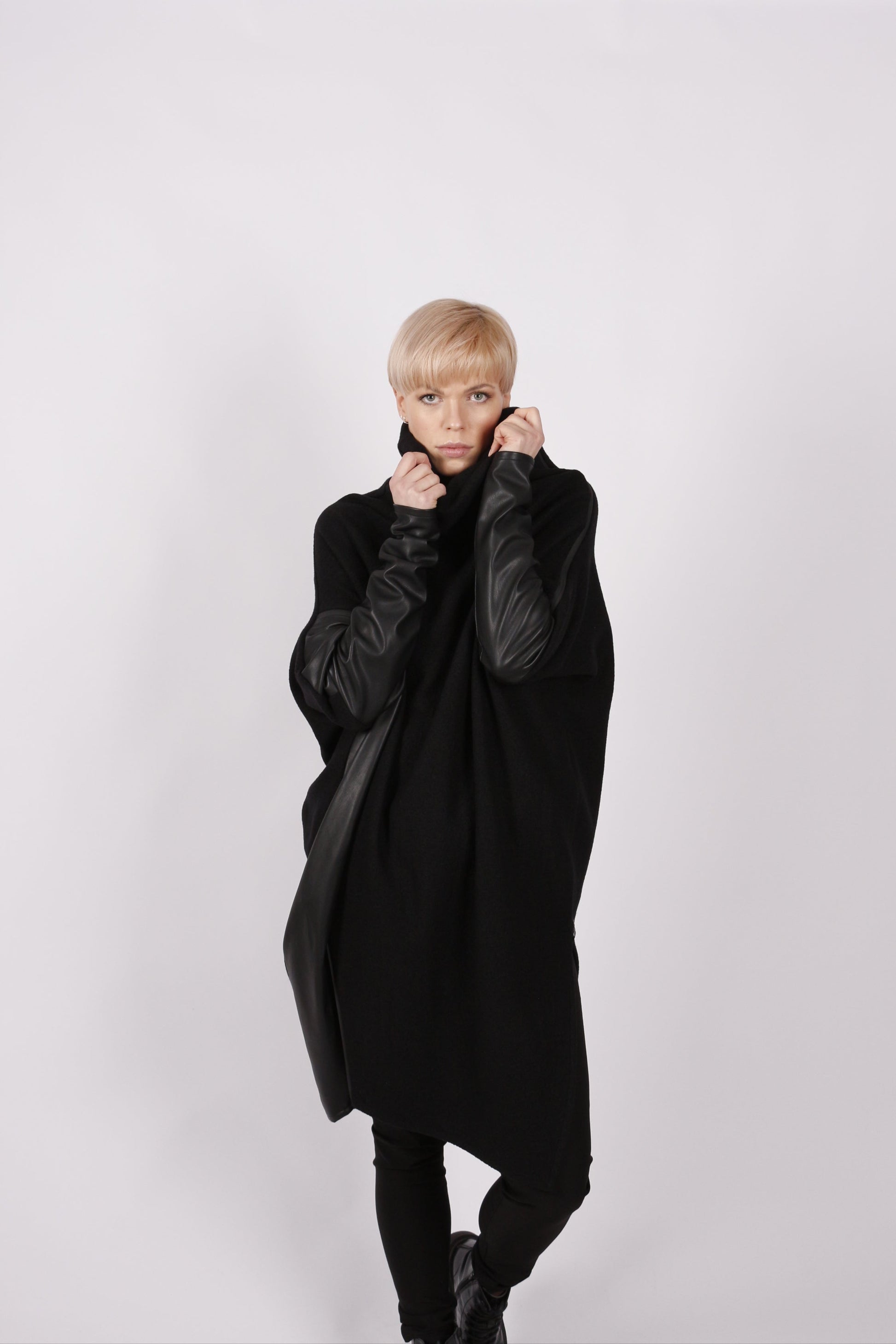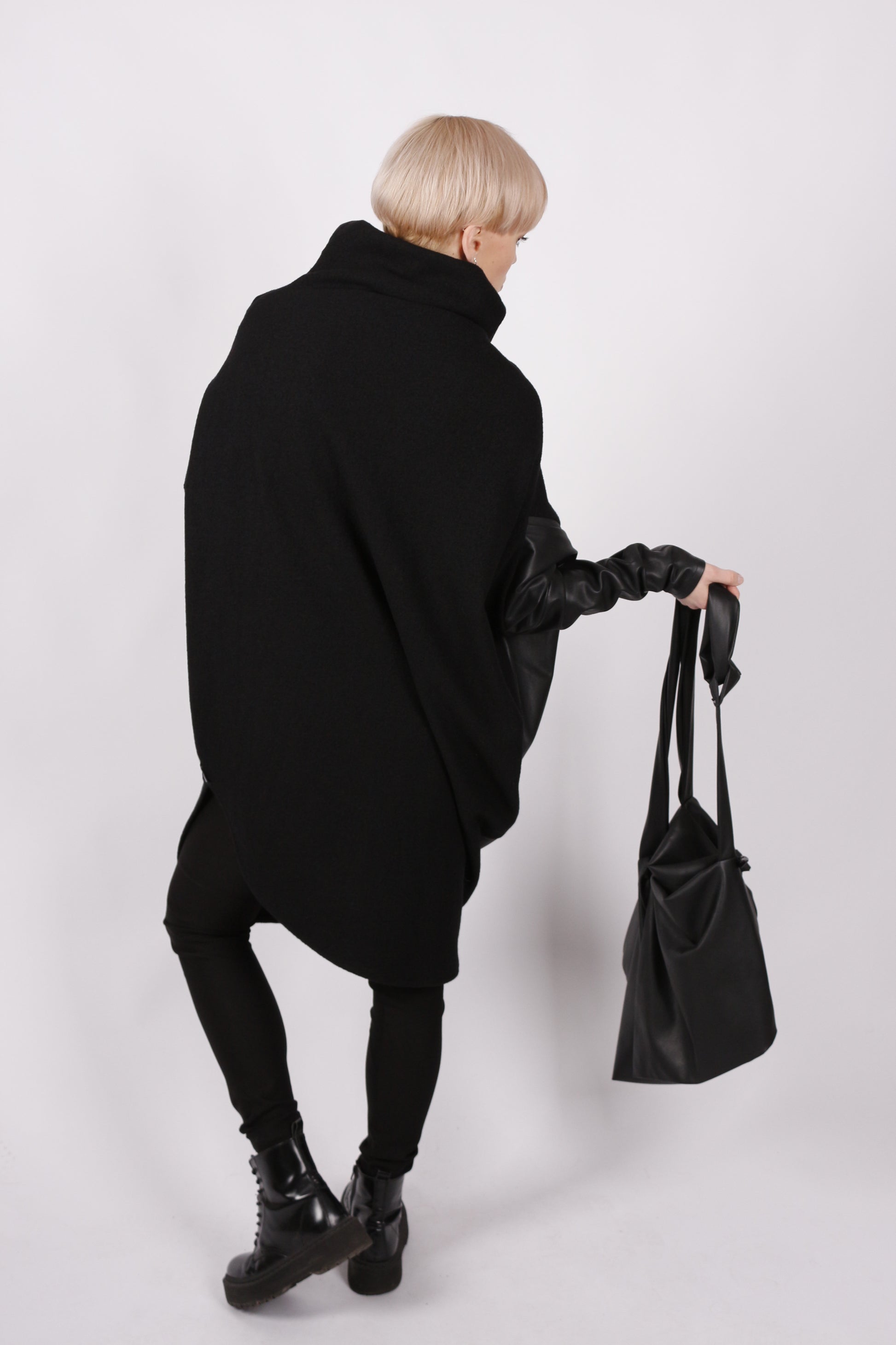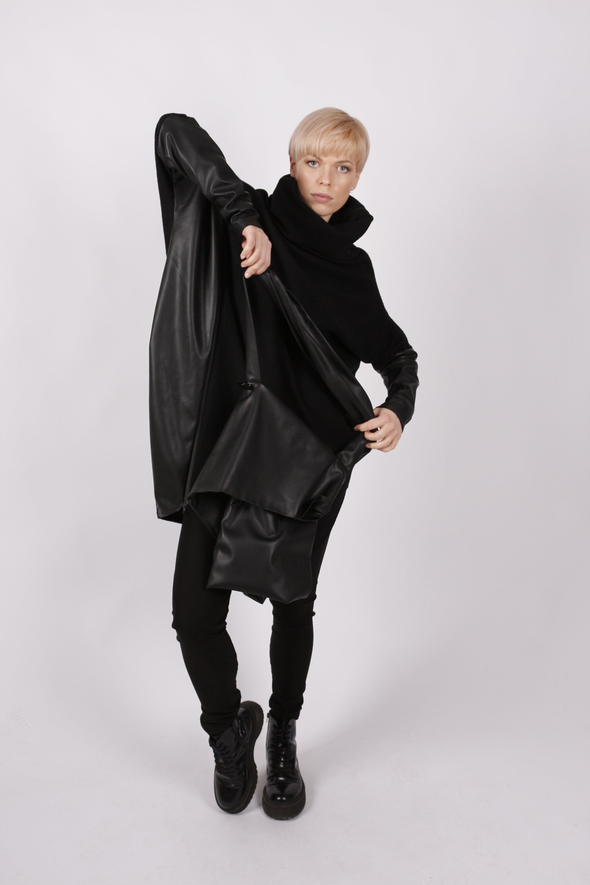 Besonders markant: die Ärmel aus weichem Kunstleder, die wie integrierte Stulpen wirken und dem Look eine kraftvolle Kante geben. Der seitlich gesetzte Reißverschluss lässt sich komplett öffnen oder schließen. So verändert sich nicht nur der Stil, sondern auch die Funktion: offen wirkt das Teil wie ein moderner Pulli, geschlossen wie ein cleaner Mantel.