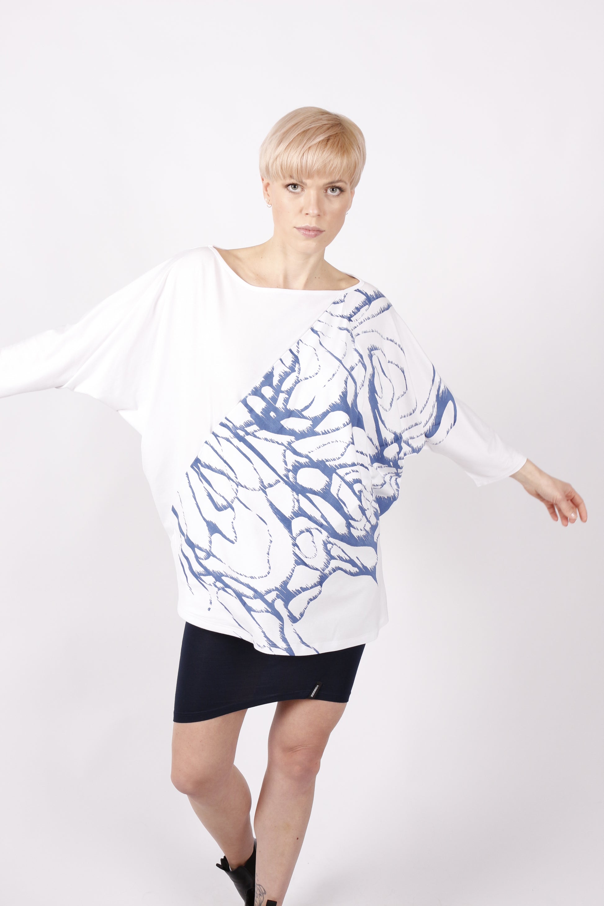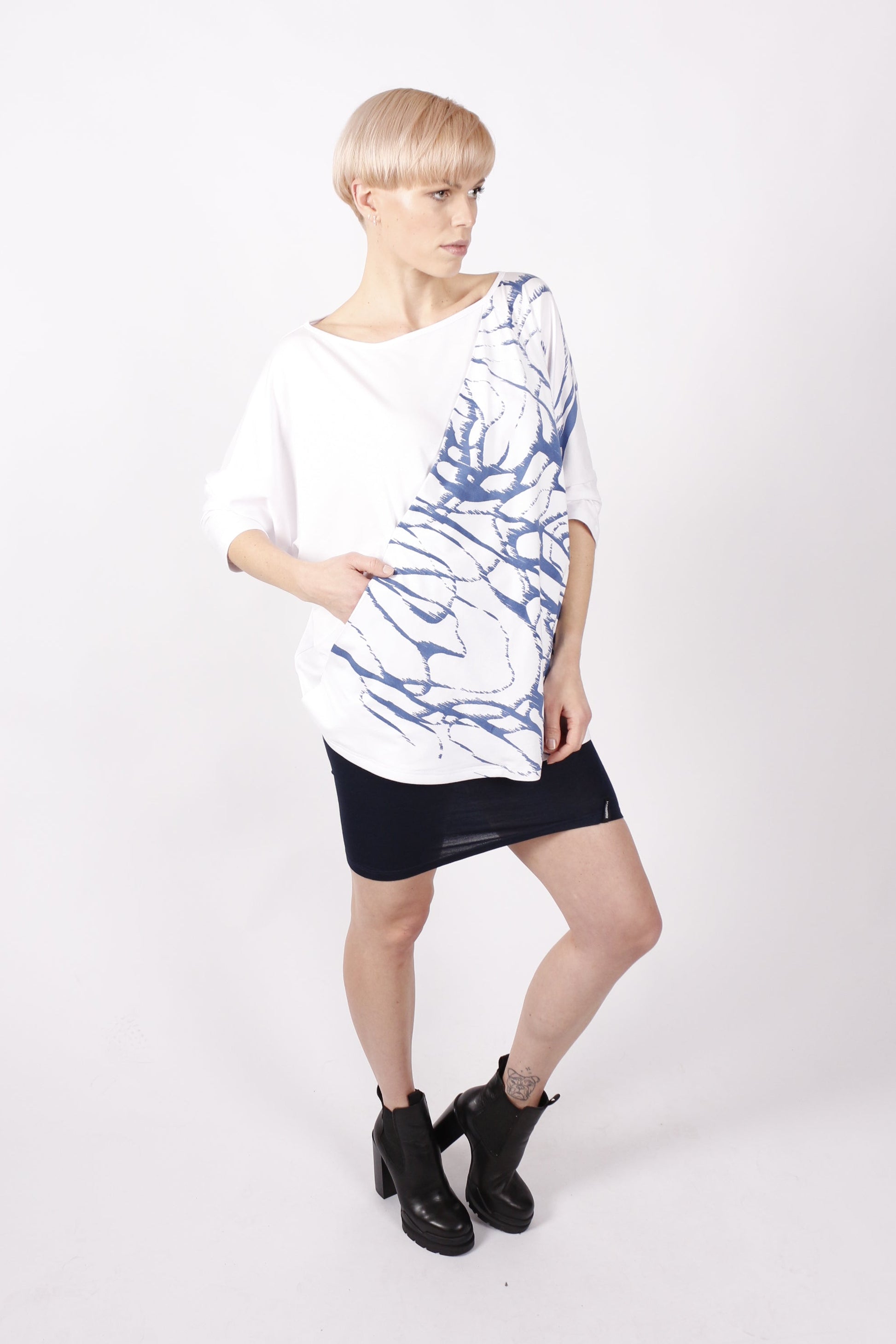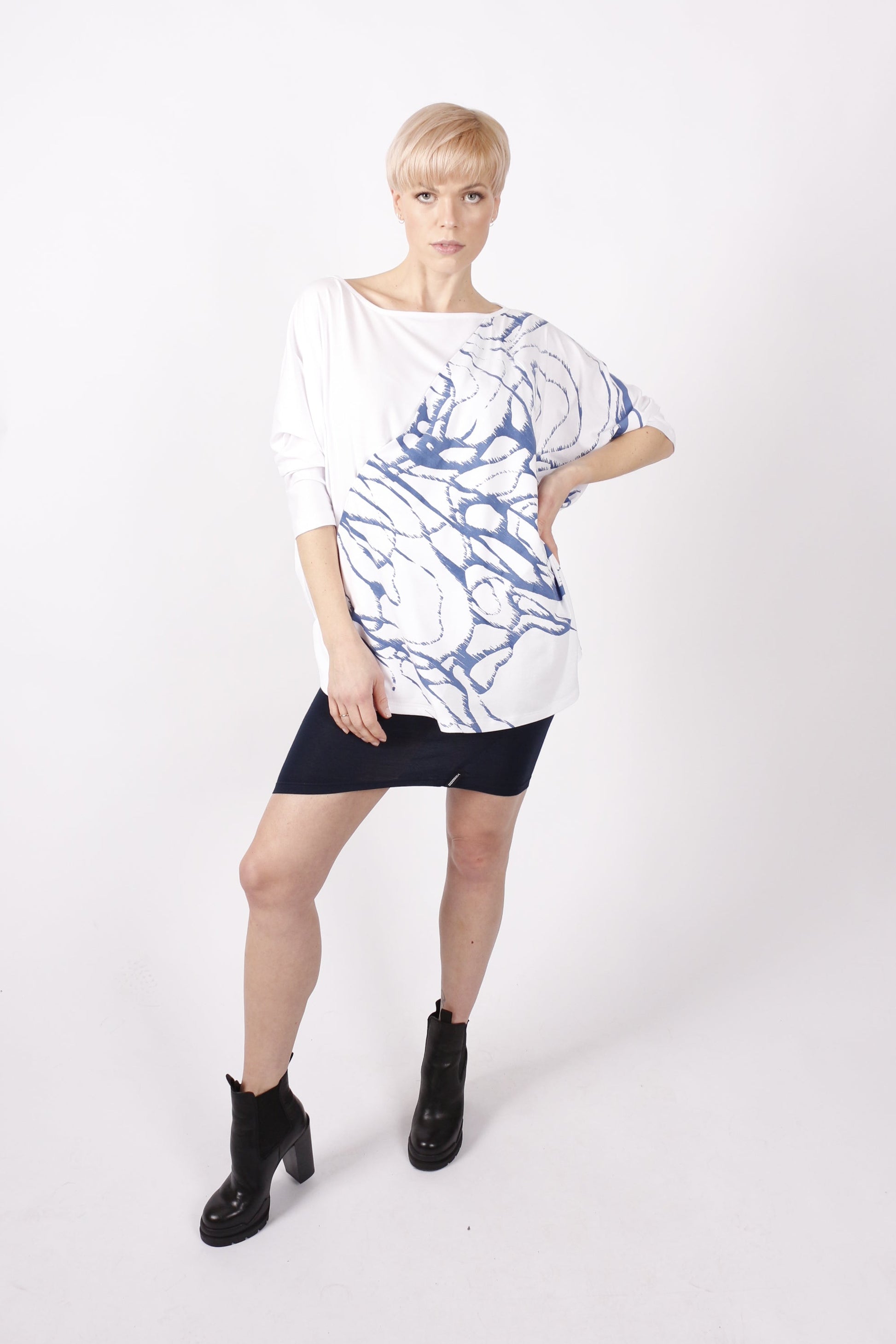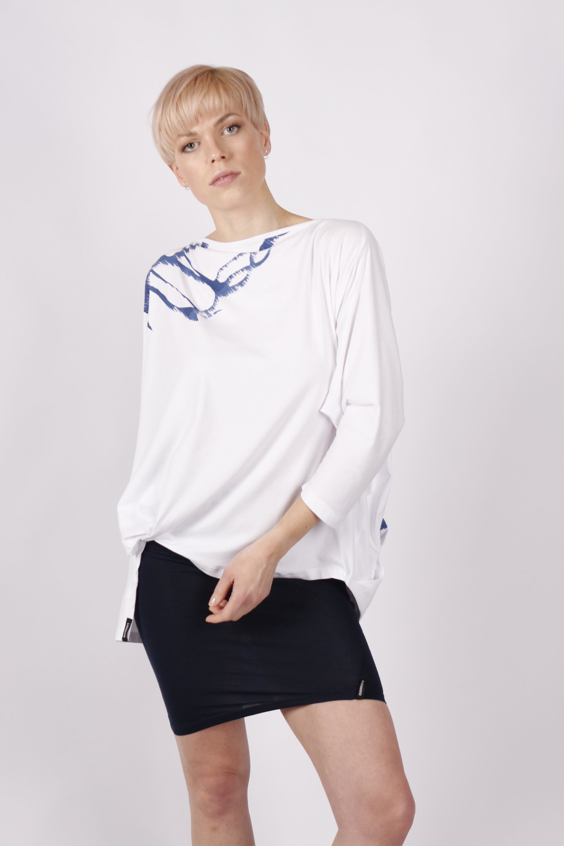 Dieses vielseitige Kaseee Oberteil überzeugt durch seine raffinierte Schnittführung und die Möglichkeit, es beidseitig zu tragen. Der hochwertige Handsiebdruck in Hellblau macht jedes Teil zu einem Unikat und sorgt für einen frischen, kunstvollen Akzent.