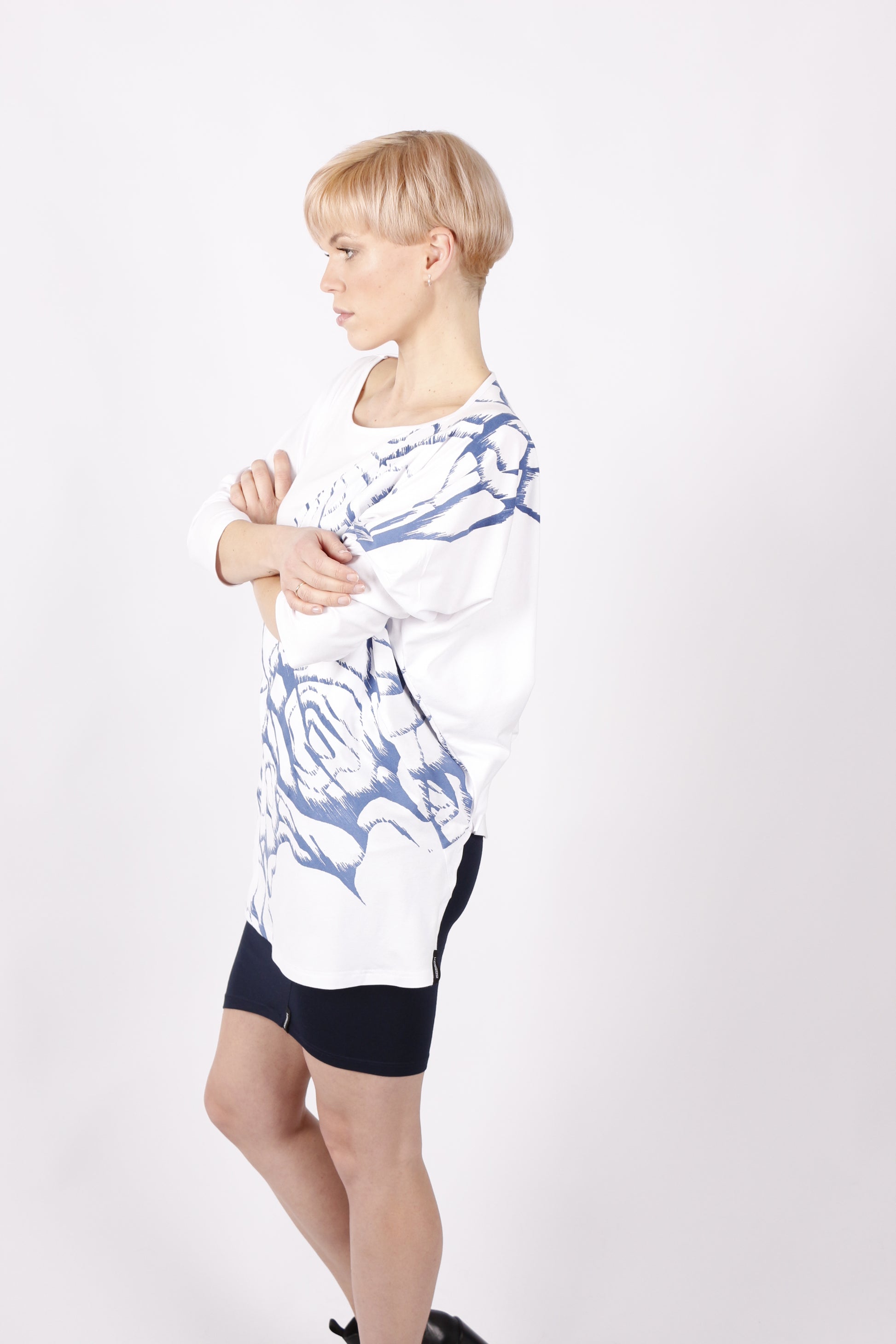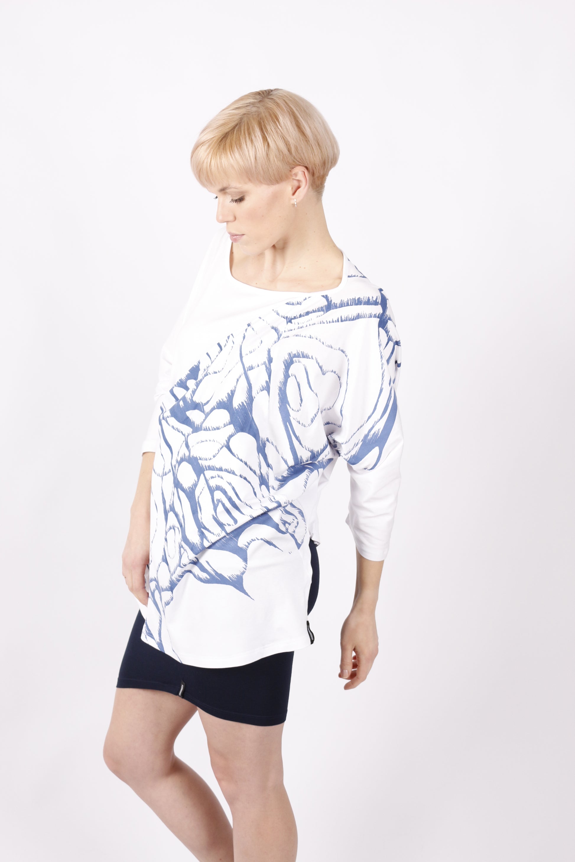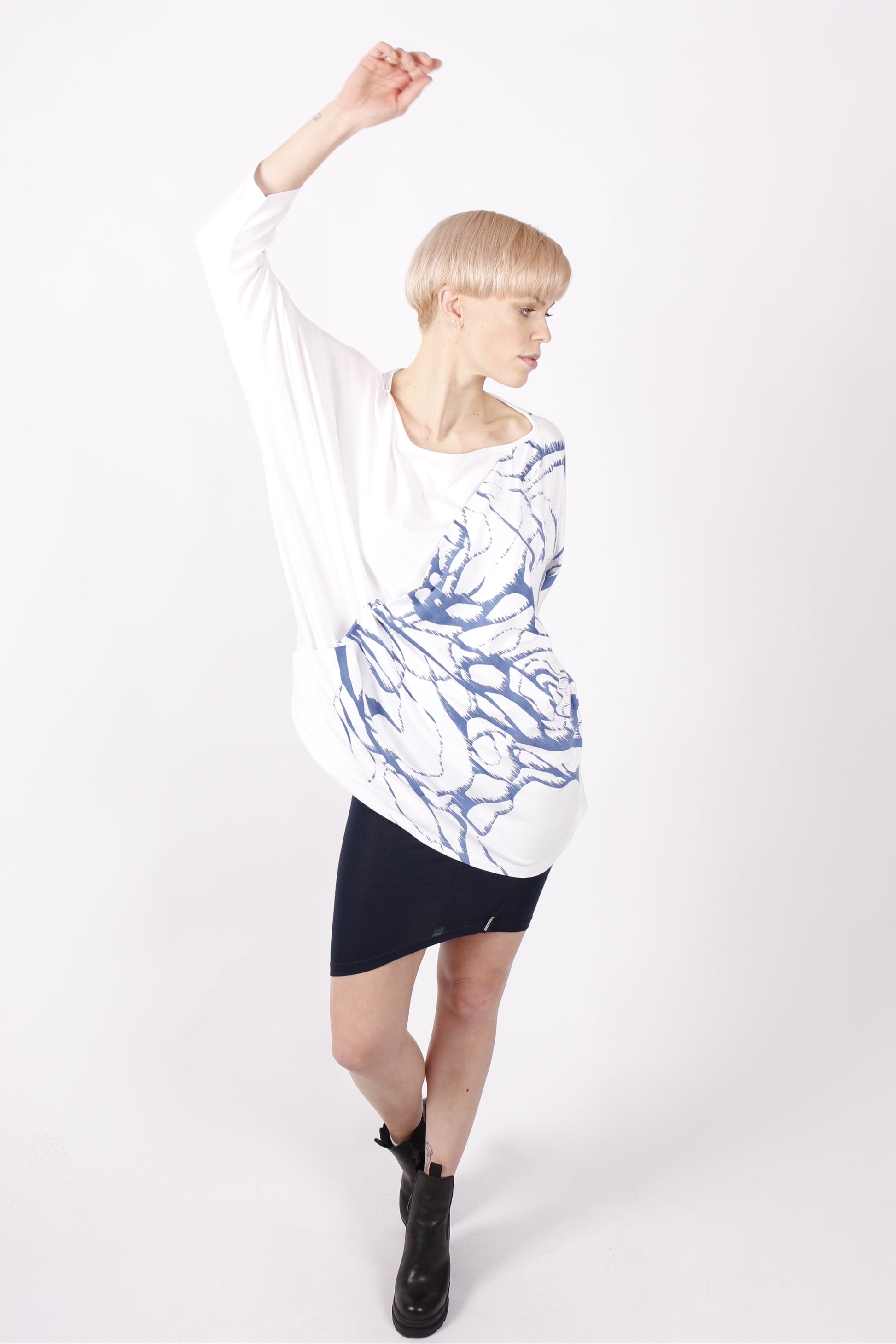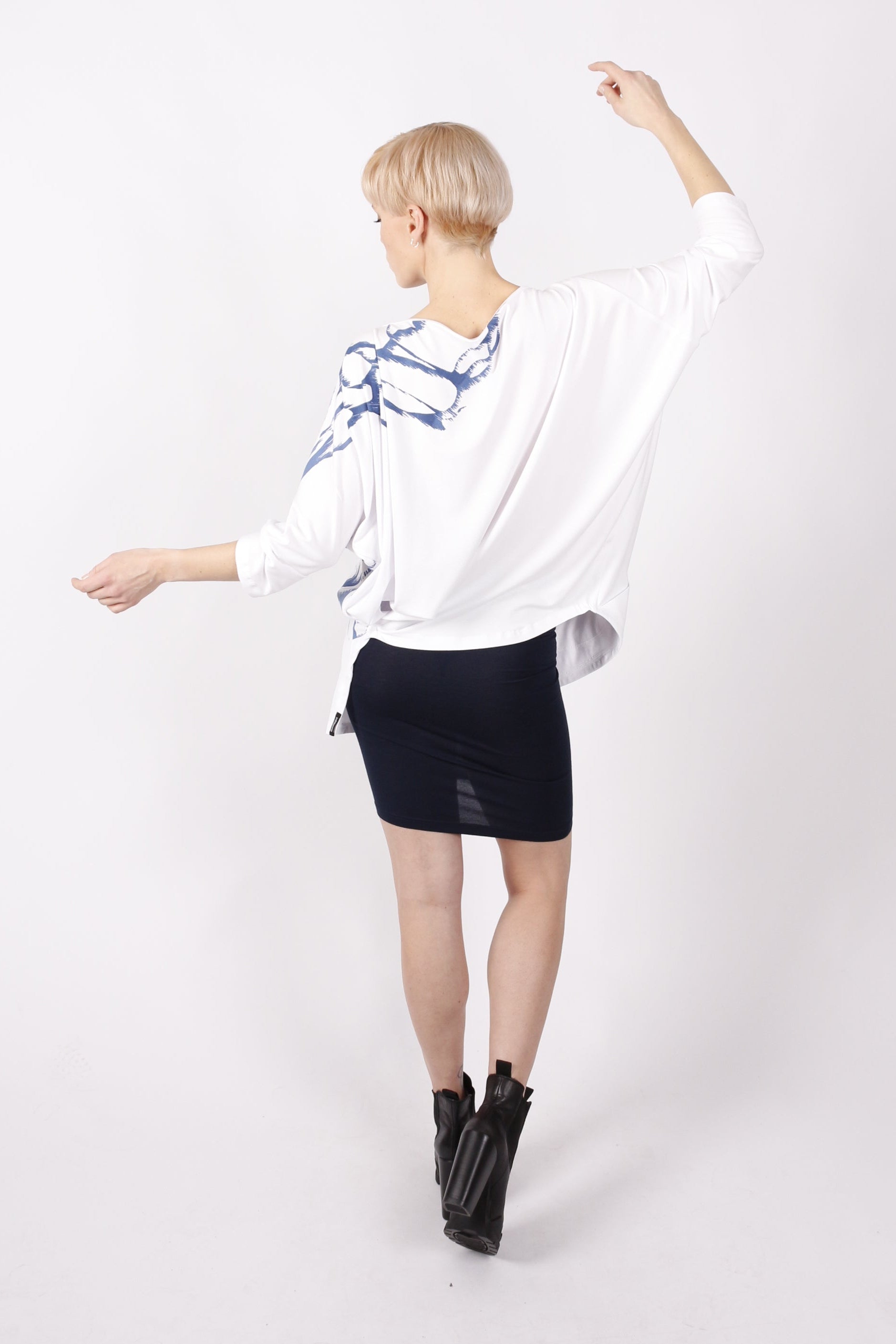 Dieses vielseitige Kaseee Oberteil überzeugt durch seine raffinierte Schnittführung und die Möglichkeit, es beidseitig zu tragen. Der hochwertige Handsiebdruck in Hellblau macht jedes Teil zu einem Unikat und sorgt für einen frischen, kunstvollen Akzent.