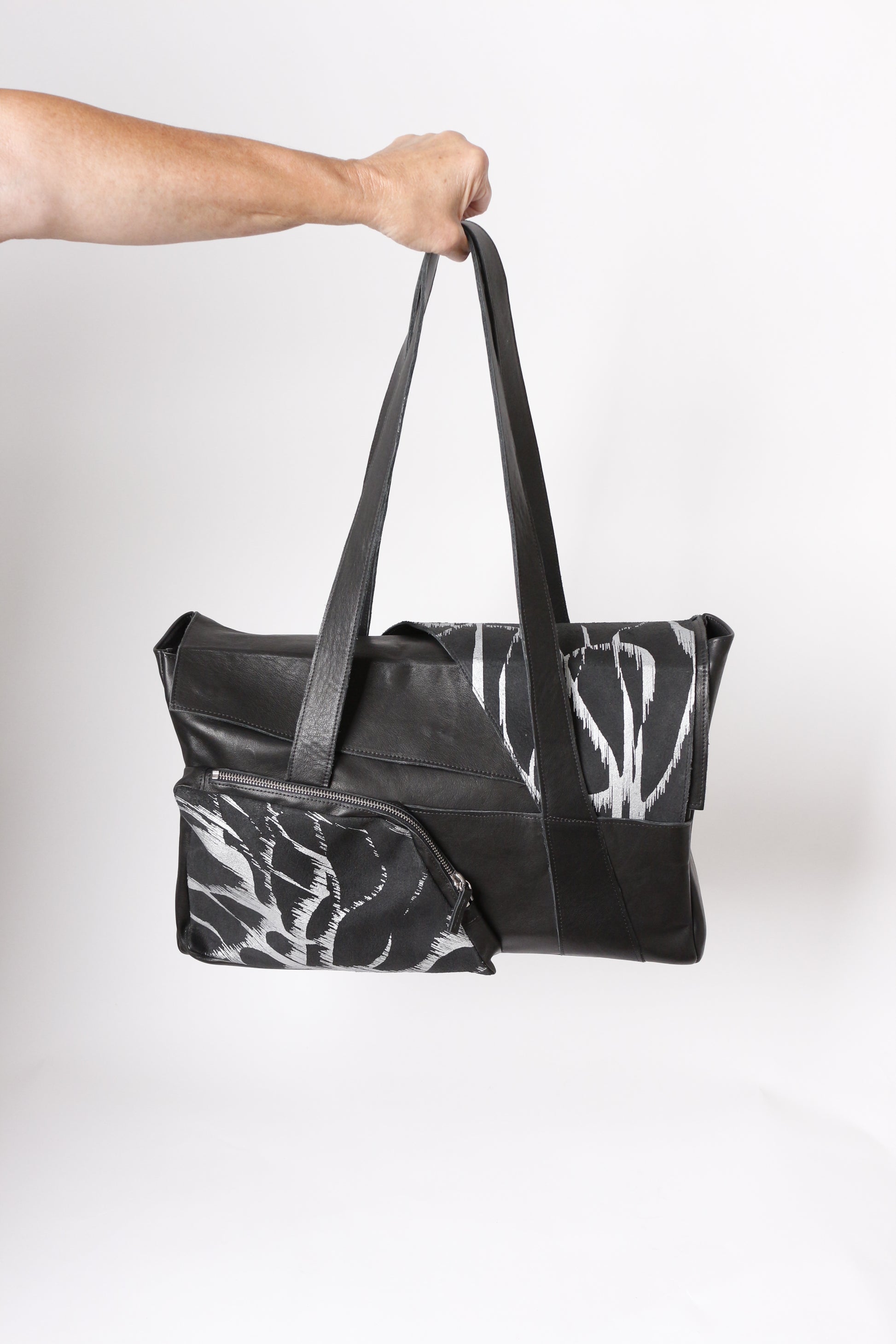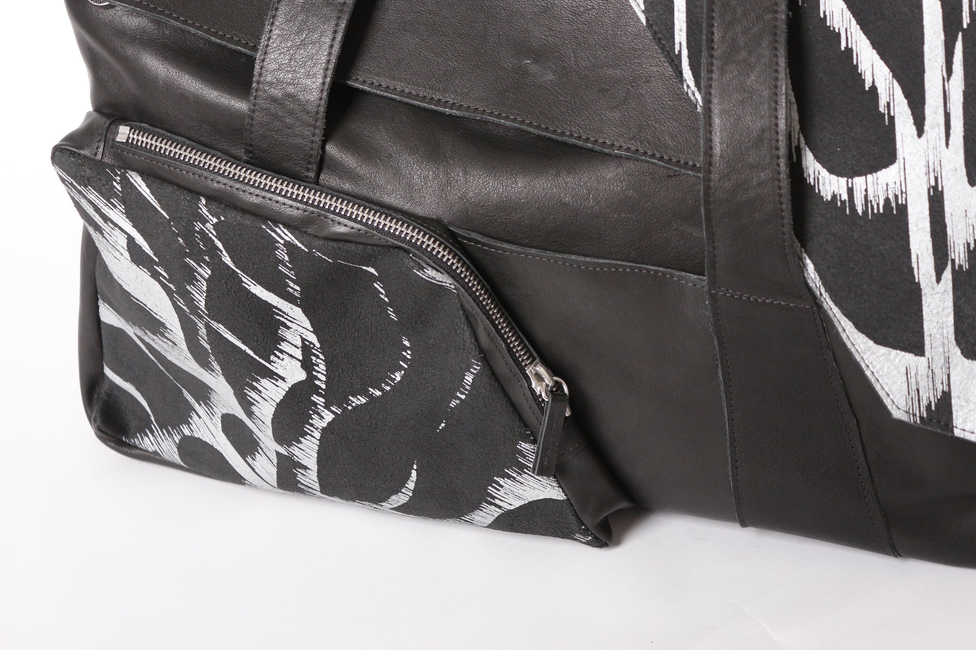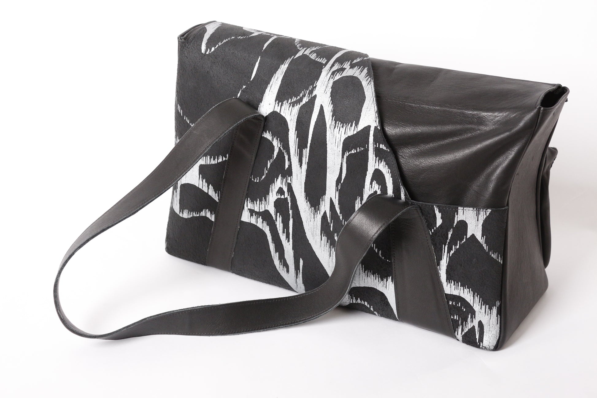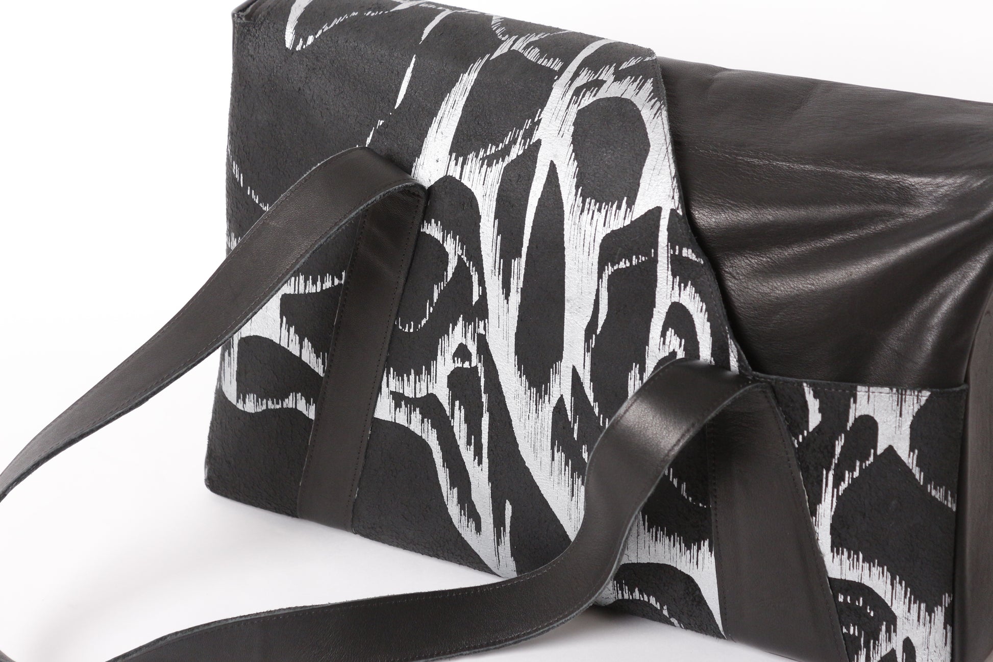 Diese exklusive kaseee Handtasche aus schwarzem Leder (pflanzlich gegerbtes Rindsleder)wird durch ihren einzigartigen, silbernen Handsiebdruck zu einem echten Statement-Piece. Der Druck bringt Glanz und Struktur ins Design und harmoniert perfekt mit den asymmetrisch gesetzten Reißverschlusstaschen auf der Außenseite, die nicht nur ein Hingucker sind, sondern auch praktische Funktion bieten. Diese Tasche vereint Handwerkskunst mit stilvollem Design.