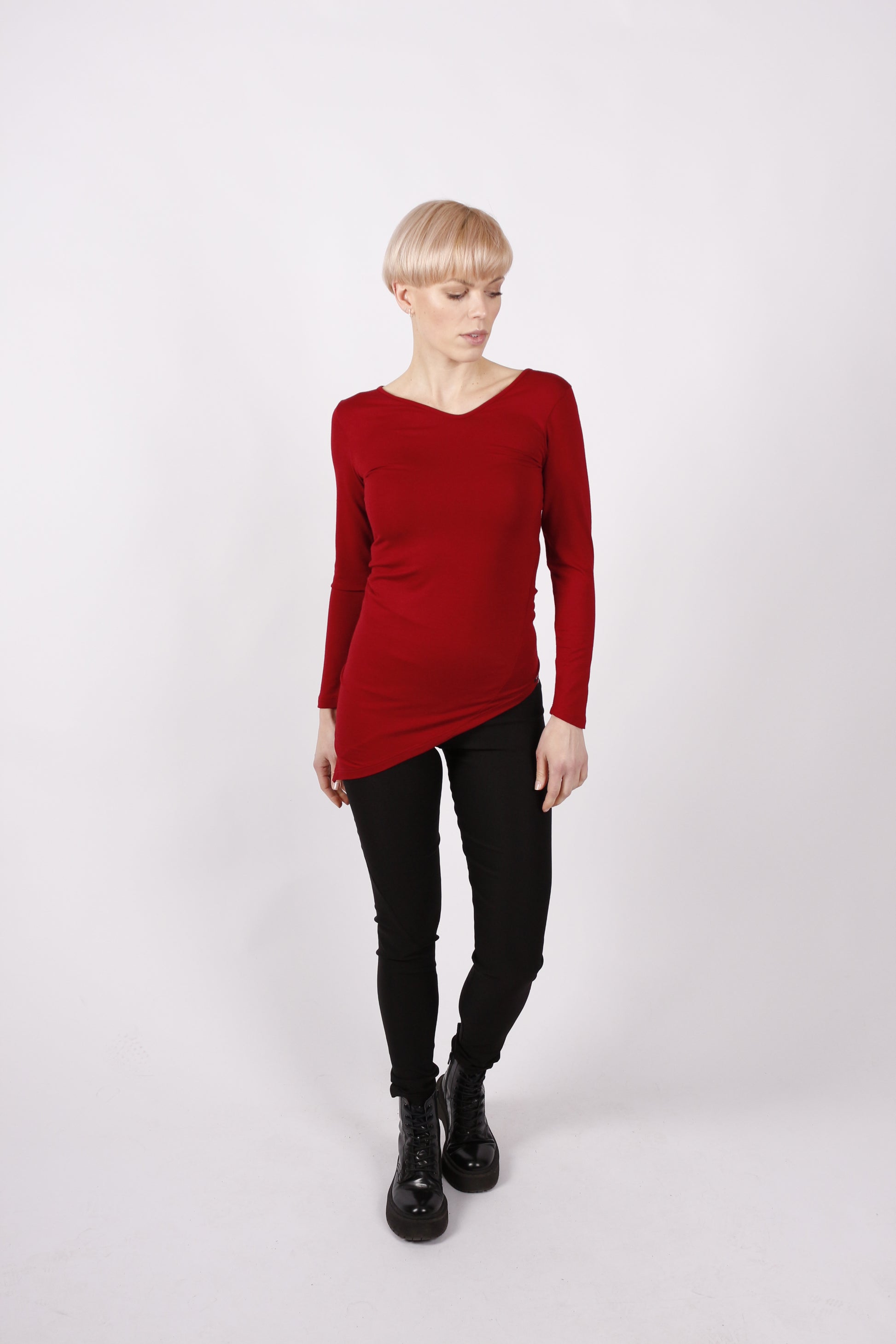 Dieses langärmelige kaseee Shirt ist mehr als nur ein Basic: Der hochwertige Viskose-Jersey fällt weich, schmiegt sich angenehm an und bringt durch feine Raffungen Bewegung in den Look. Eine Seite ist leicht verlängert und läuft dezent spitz zu – so entsteht die typische asymmetrische Kaseee-Silhouette.