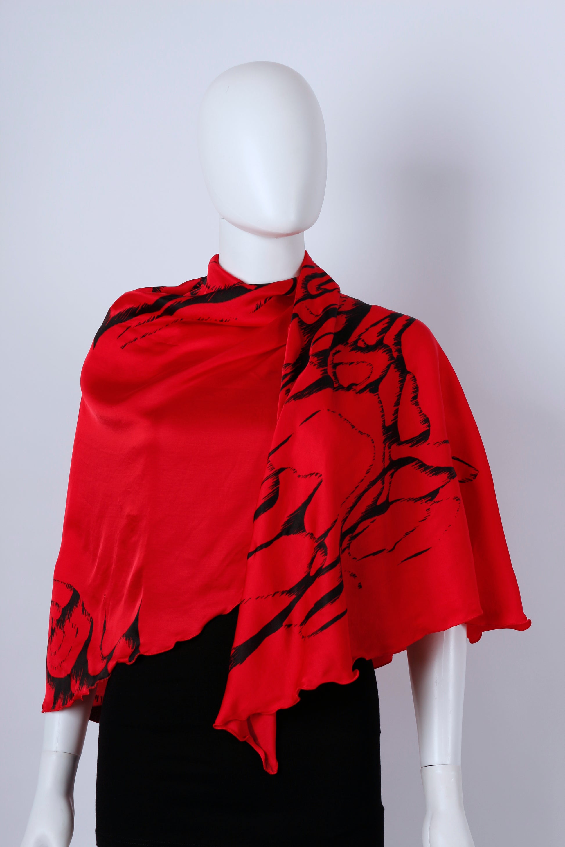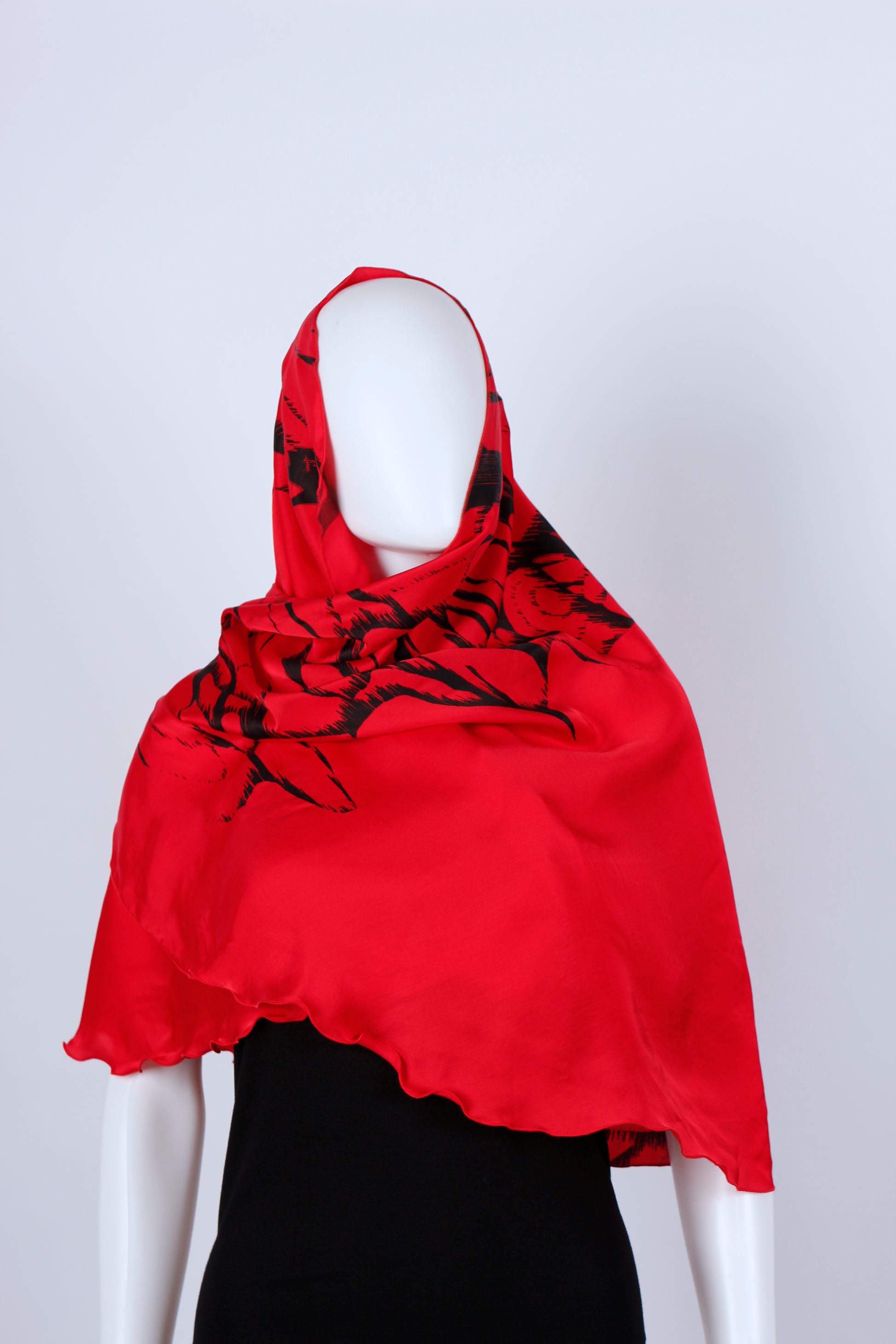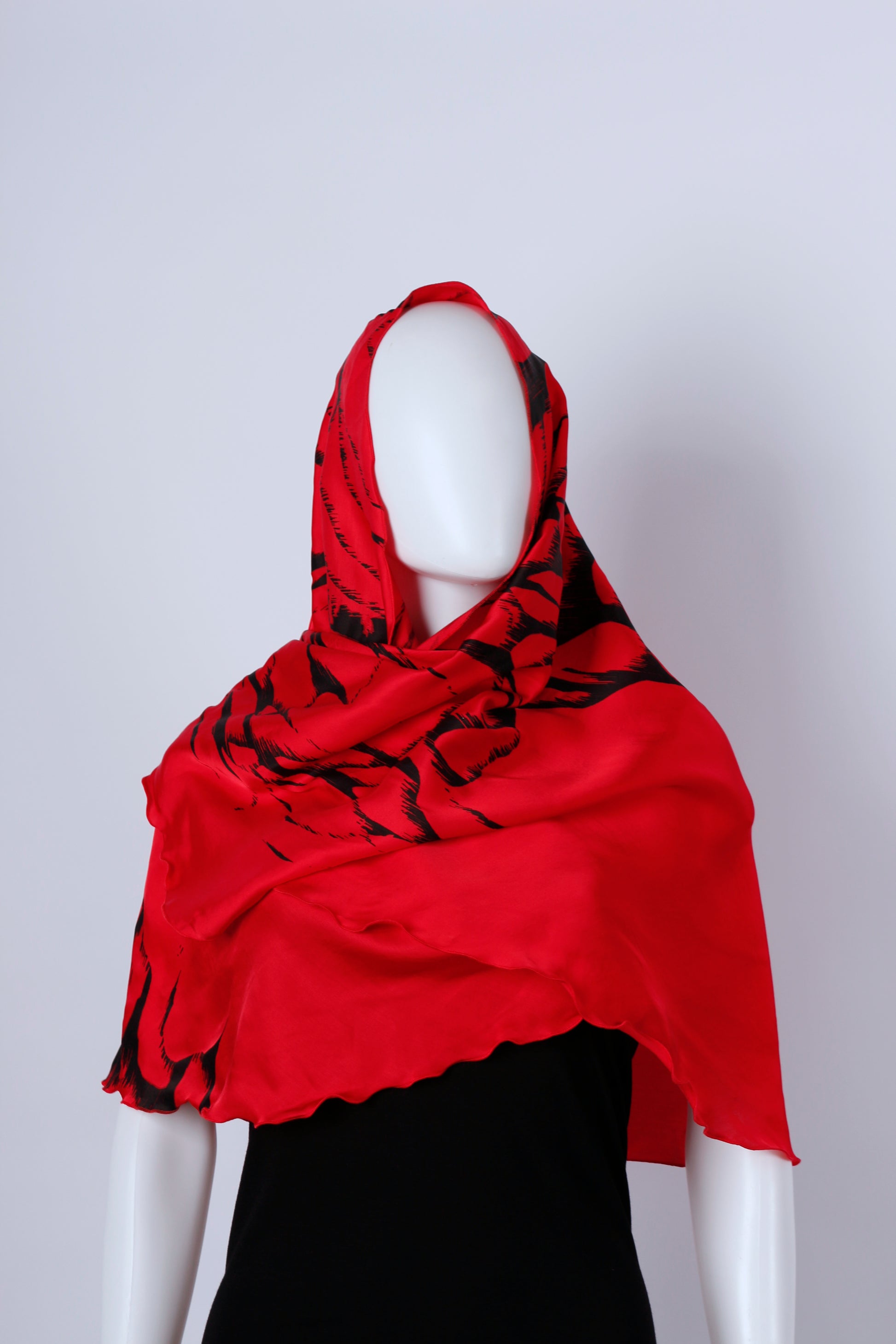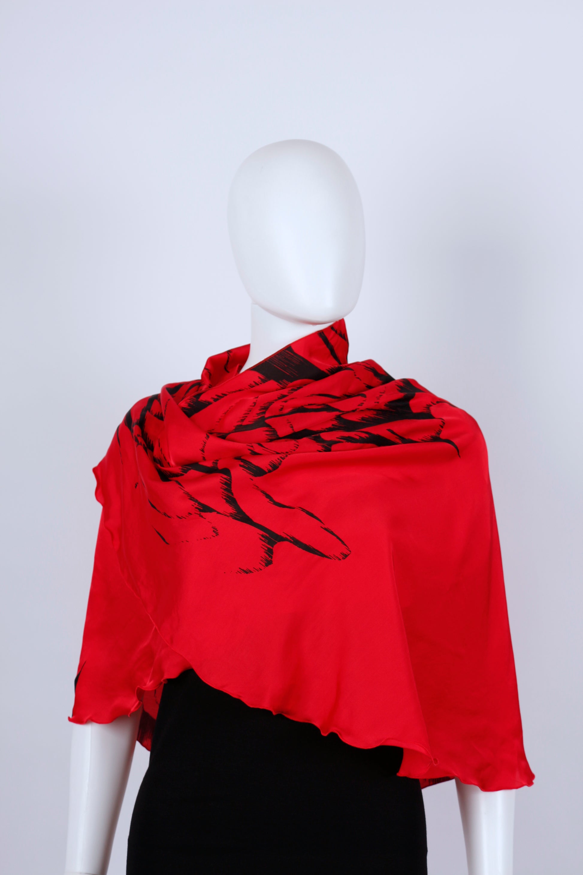 Die blattähnliche Schnittform verleiht dem Tuch eine fließende, organische Silhouette und macht es vielseitig tragbar: klassisch um den Hals oder elegant über die Schultern als Poncho oder Überwurf. Der schwarze Handsiebdruck wird in Handarbeit aufgebracht und setzt einen wirkungsvollen Kontrast zur kräftigen Grundfarbe – jedes Stück ist ein Unikat.