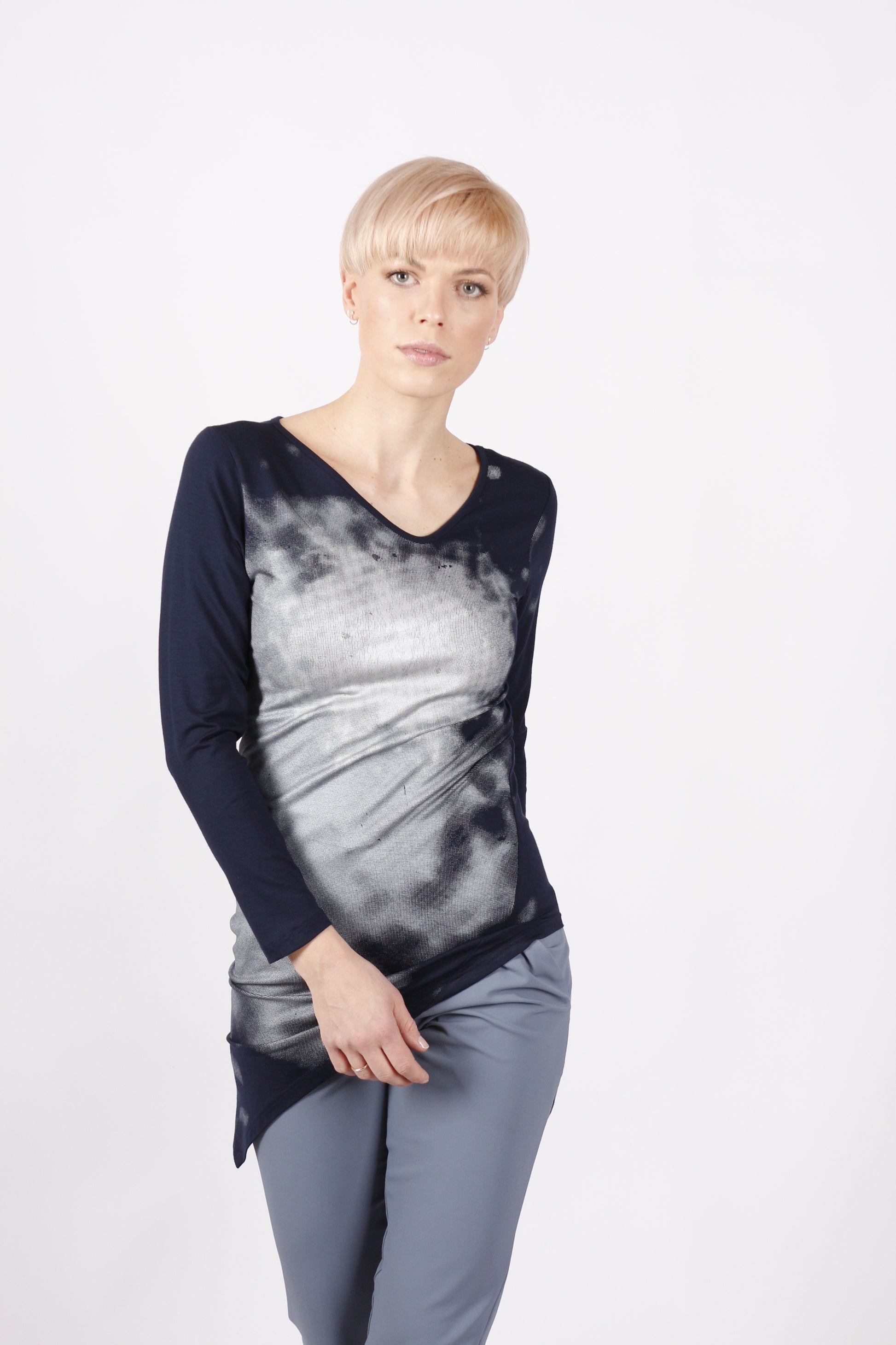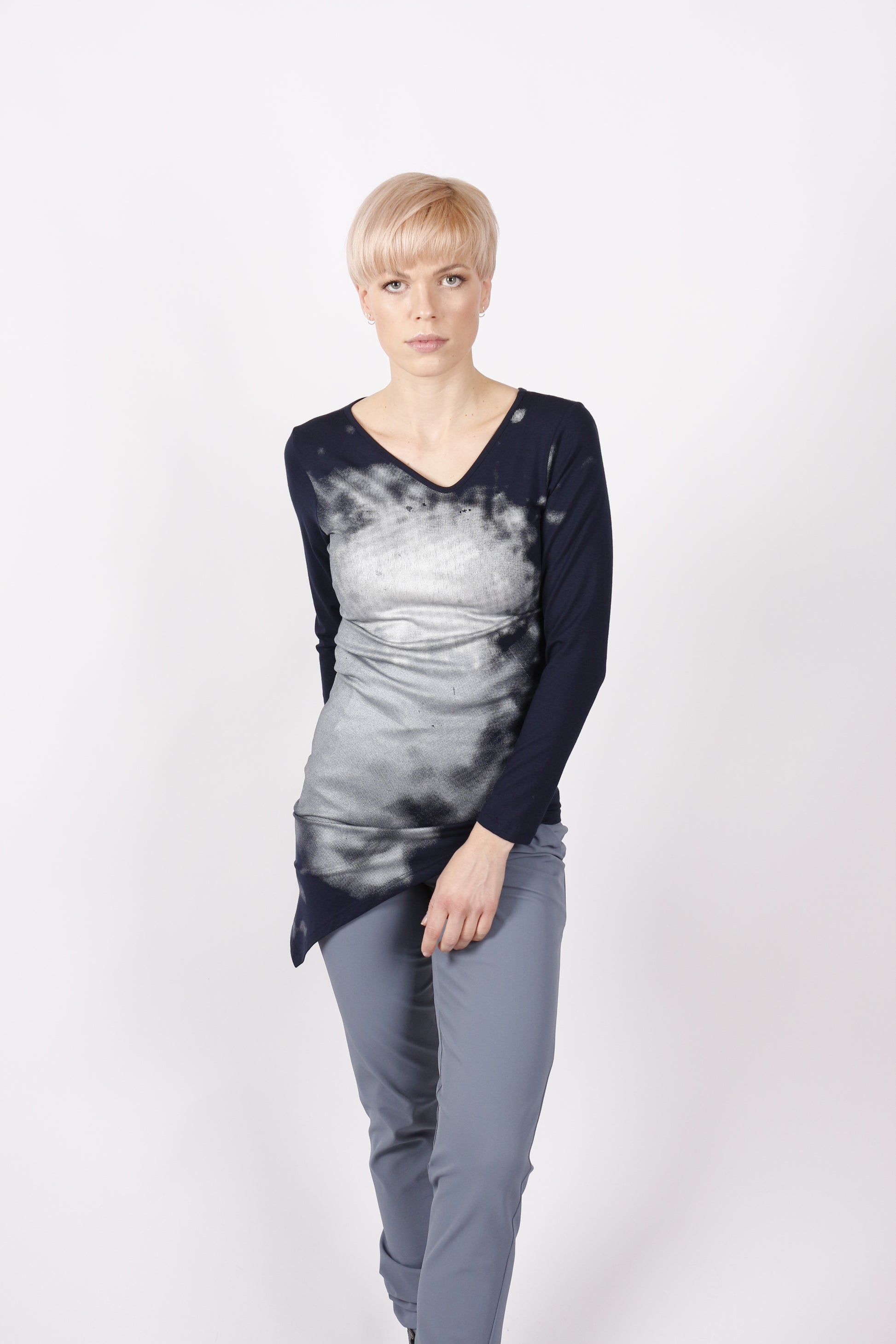 Das kaseee Shirt ist ein echter Kaseee-Klassiker – beliebt für seinen markanten Schnitt und seine Wandelbarkeit. Eine Seite ist länger geschnitten, was die Silhouette optisch streckt und für eine schlanke, moderne Form sorgt. Der silberne Handsiebdruck verleiht dem Shirt eine besondere Eleganz, bleibt dabei aber dezent und stilvoll.