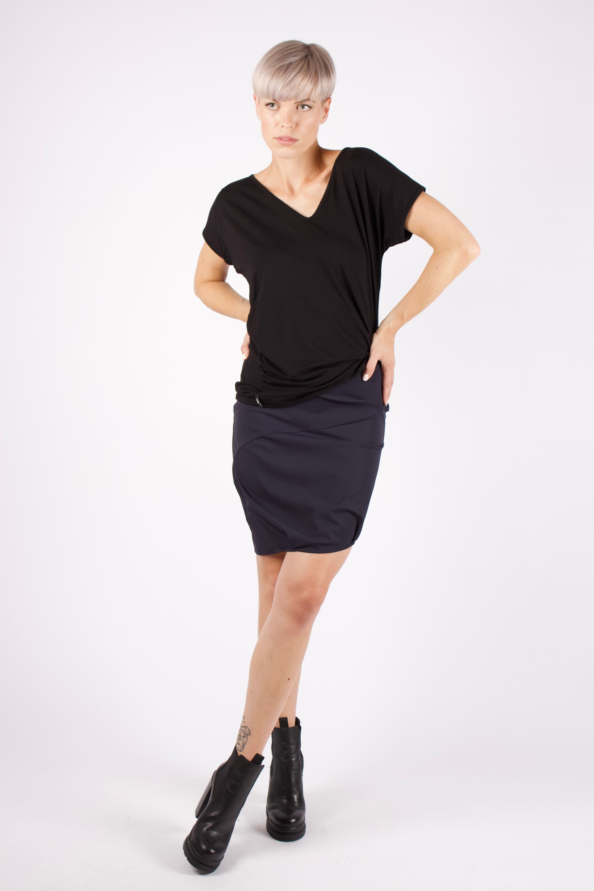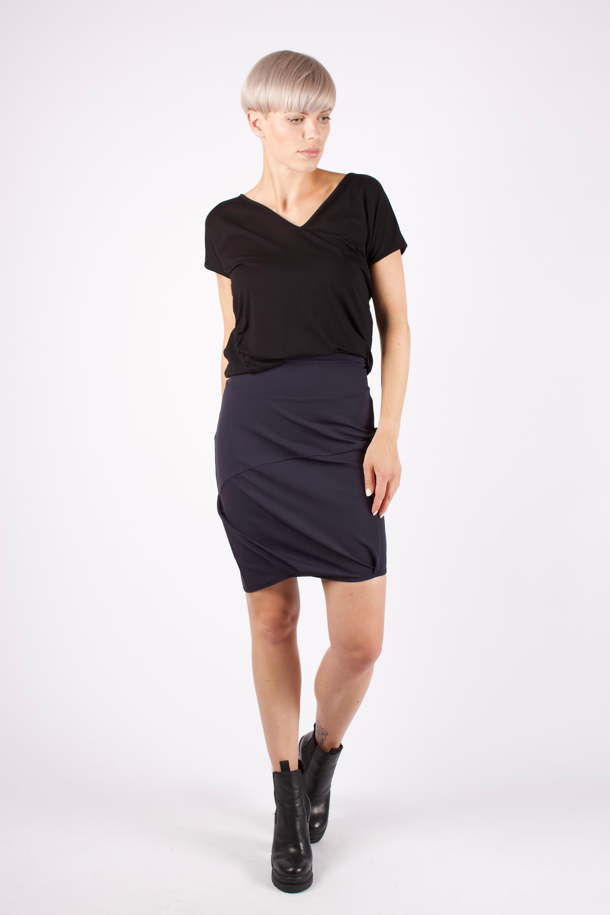 Der Rock ist, wie typisch für Kaseee, asymmetrisch durch Falten, Saum und Nähte. Das Tragegefühl ist durch Form, den breiten Bund und den atmungsaktiven Stoff sehr angenehm. Je nachdem wie man den Rock trägt, ist die Rocklänge vorne etwas kürzer als hinten etwas länger. Durch den Elasthananteil im Material ist der Rock zum schlüpfen.